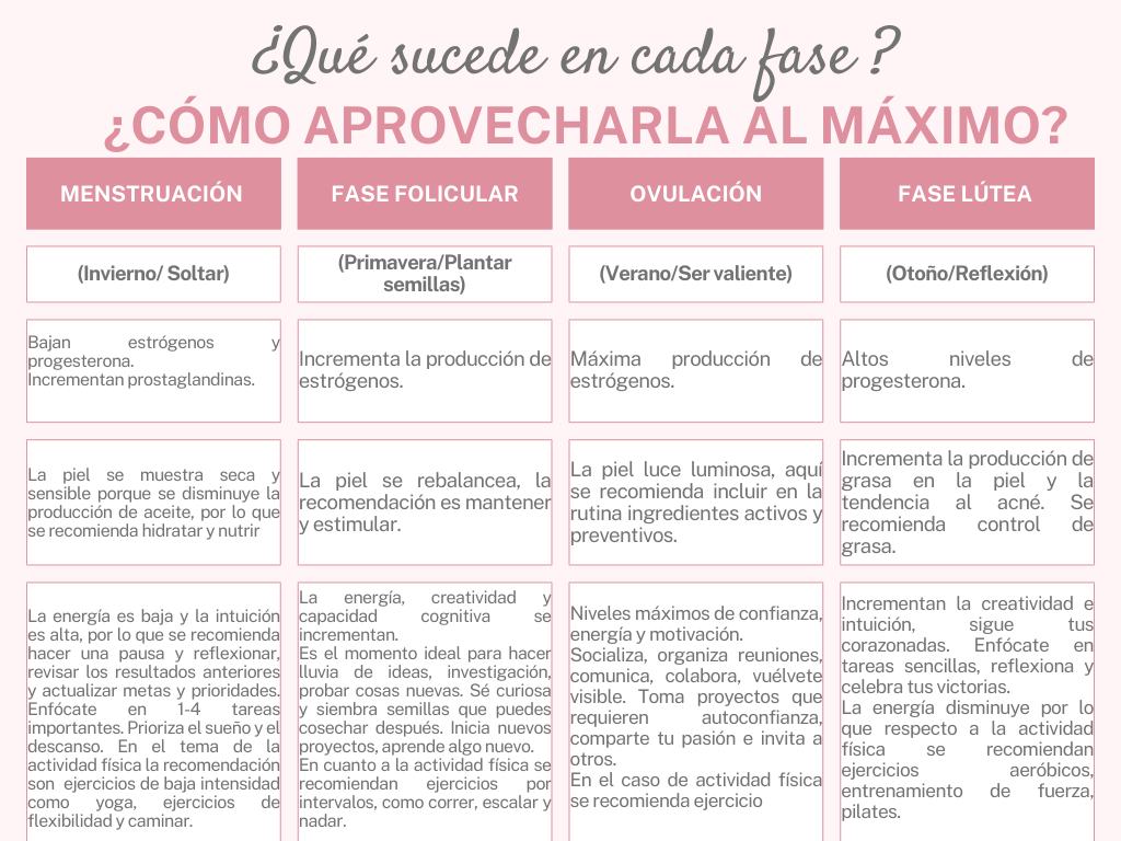 Es común escuchar que cuando una mujer está de mal humor seguro está en sus días y eso en algunas ocasiones puede ser cierto, hay que reconocer que mes a mes las mujeres experimentamos cambios hormonales que tienen impacto en nuestras emociones, debemos entender que así como la luna pasa por cuatro fases, en el año hay cuatro estaciones, las mujeres experimentamos un ciclo que tiene cuatro etapas. Si bien el ciclo puede ser diferente para cada mujer y variar de 21 hasta 35 días, las etapas se mantienen constantes para todas.